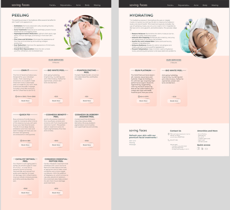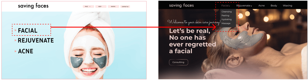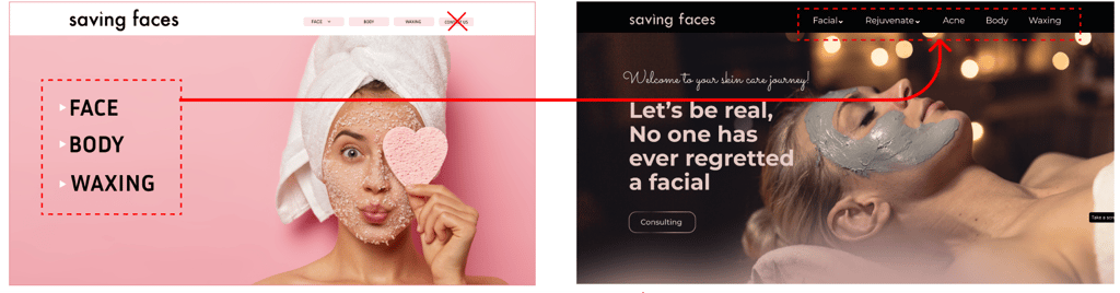 To address this issue, we revised the sitemap and implemented the dropdown menu, which displays the facial menu subsets directly.